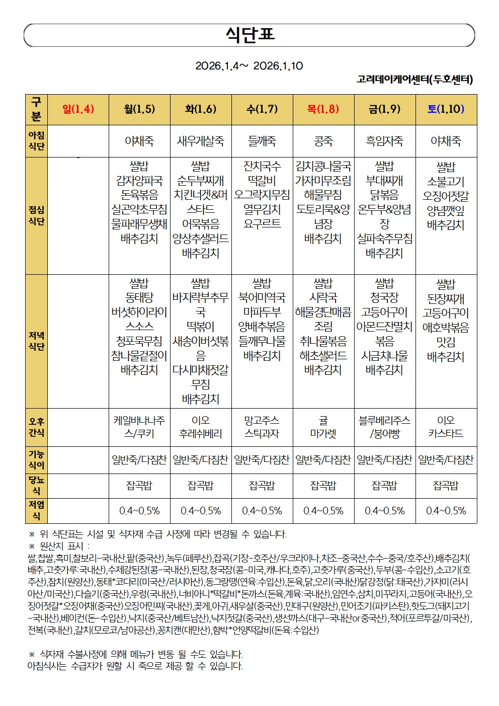 • 26년 1월1주차 식단표