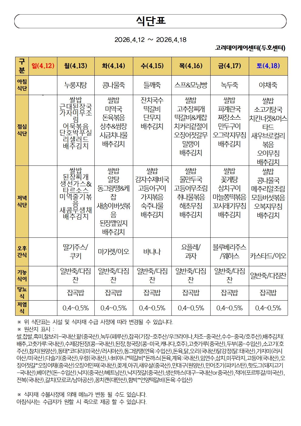 • 26년 4월 3주차 식단표